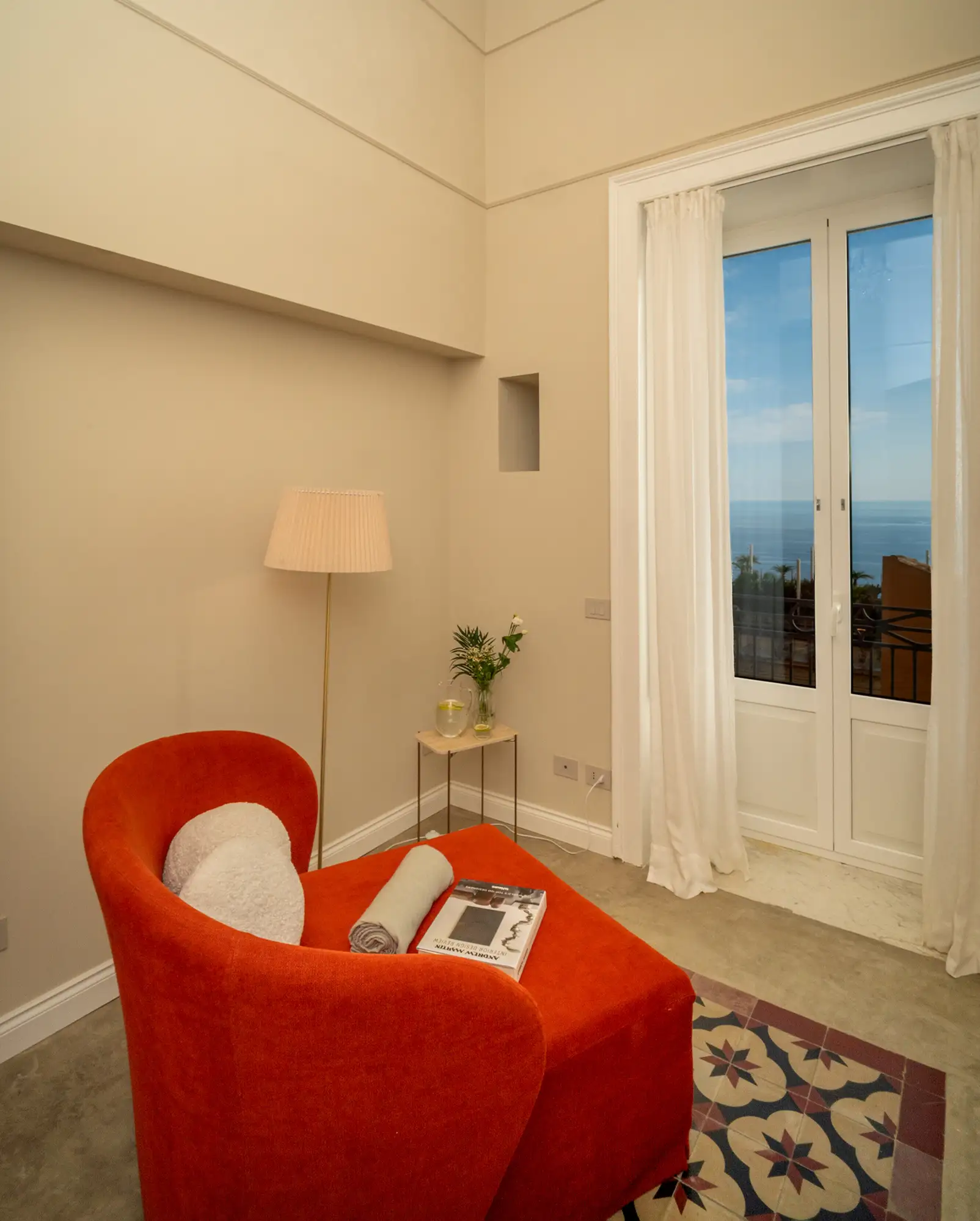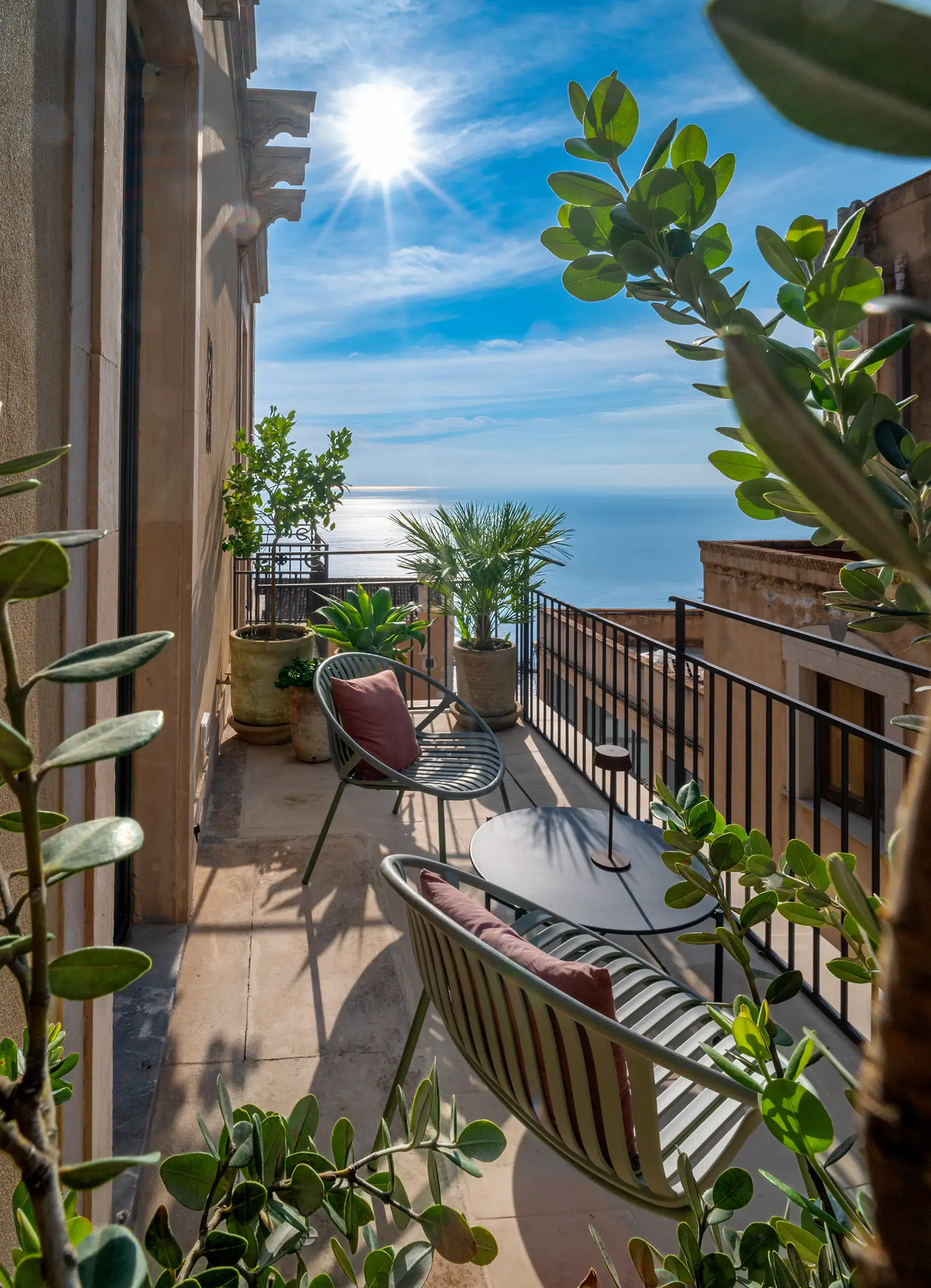 This room is designed to serve as your private, luminous retreat. From your small balcony, you command dramatic views that capture the energy of the main piazza and the infinite expanse of the Ionian Sea. The high ceilings underscore a sense of historic elegance. The lbathroom includes a walk-in rain shower and is stocked with exclusive Ortigia skin care products and plush bathrobes. All essential comforts are managed effortlessly, including universal electrical outlets at the bedside and individual climate control.