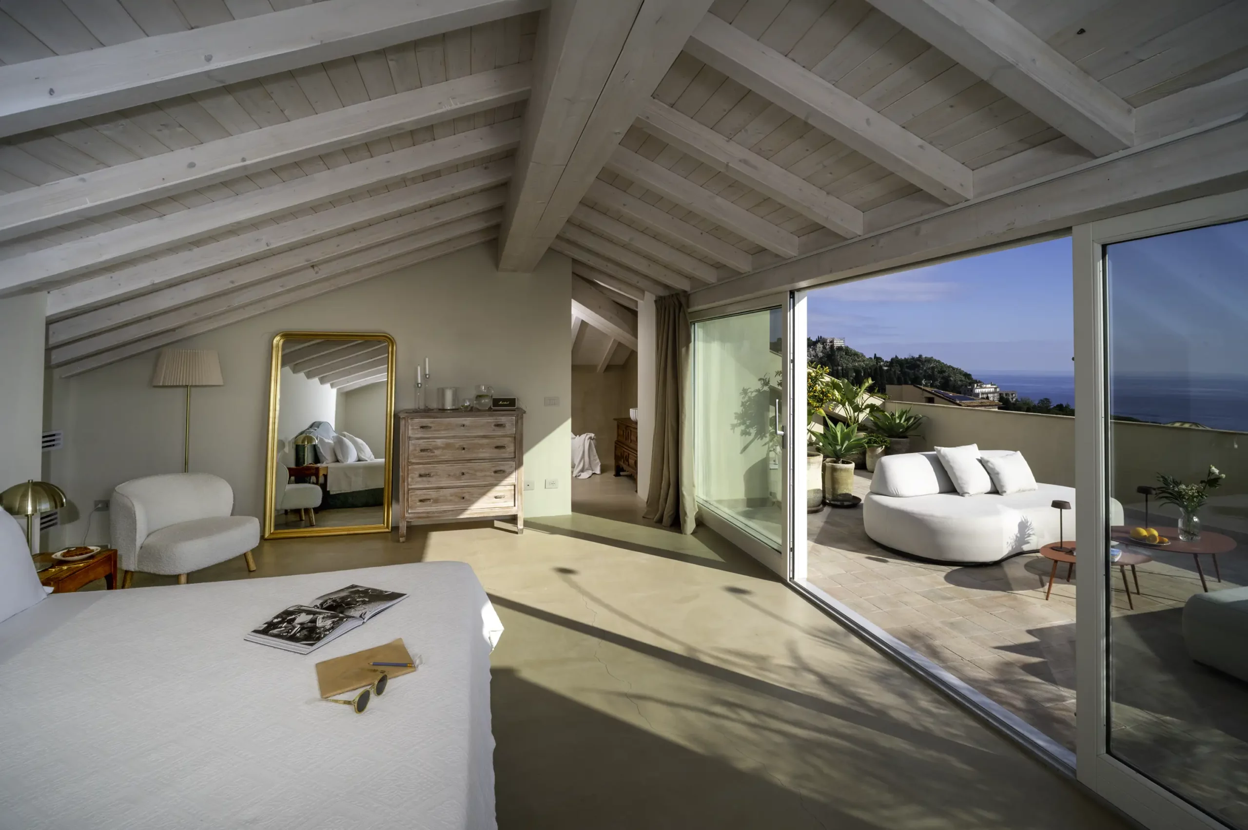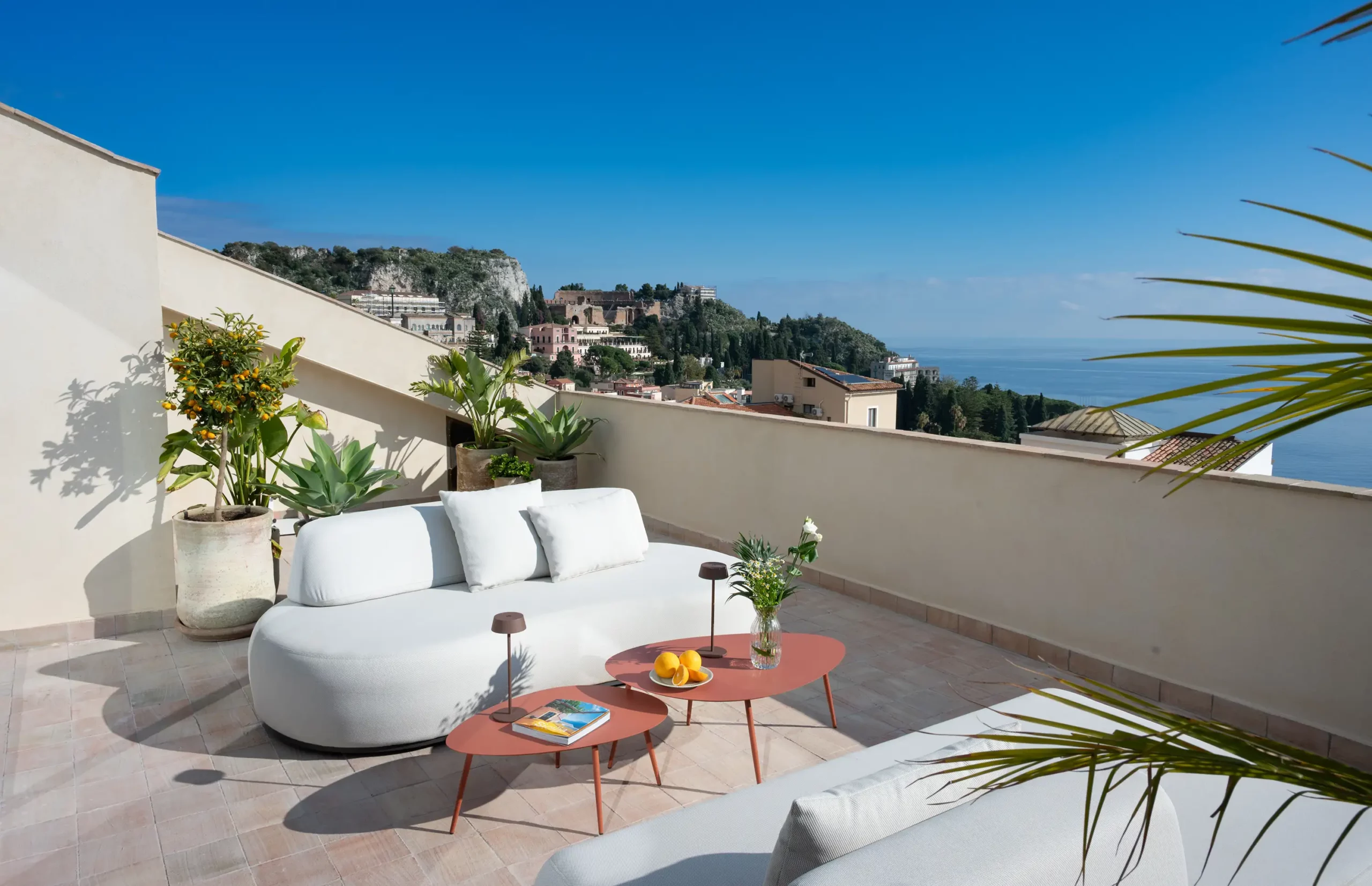 Our Superior Suite offers our most exclusive and expansive experience. This ultimate haven commands a breathtaking, panoramic vista encompassing Taormina, the entire Giardini Naxos Bay, and the dramatic silhouette of Mount Etna.