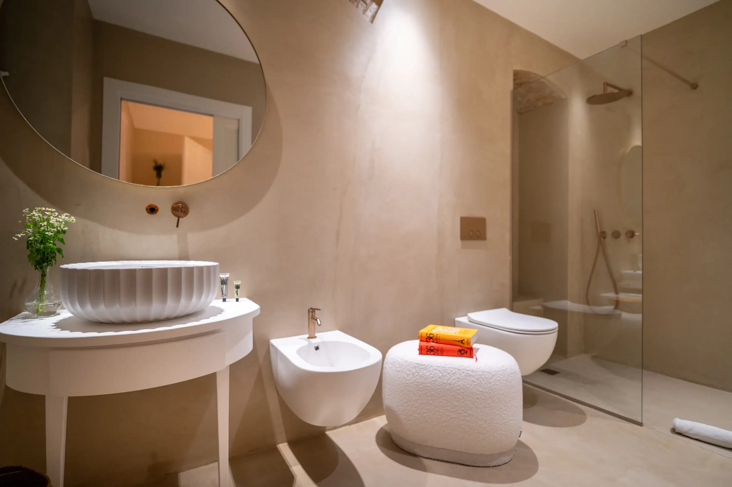 Bathroom with a walk-in rain shower and premium Ortigia products.