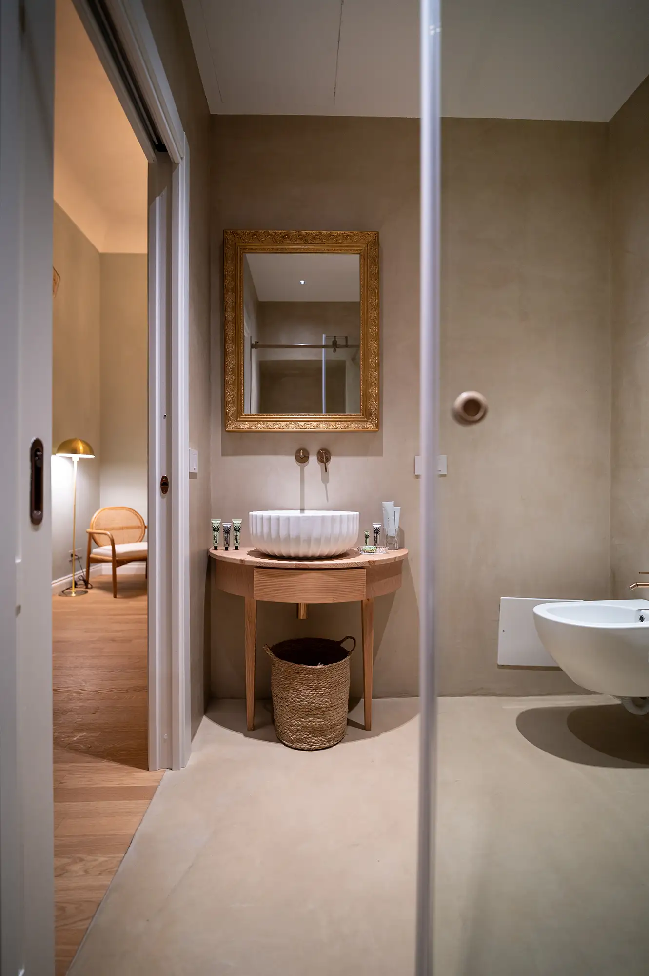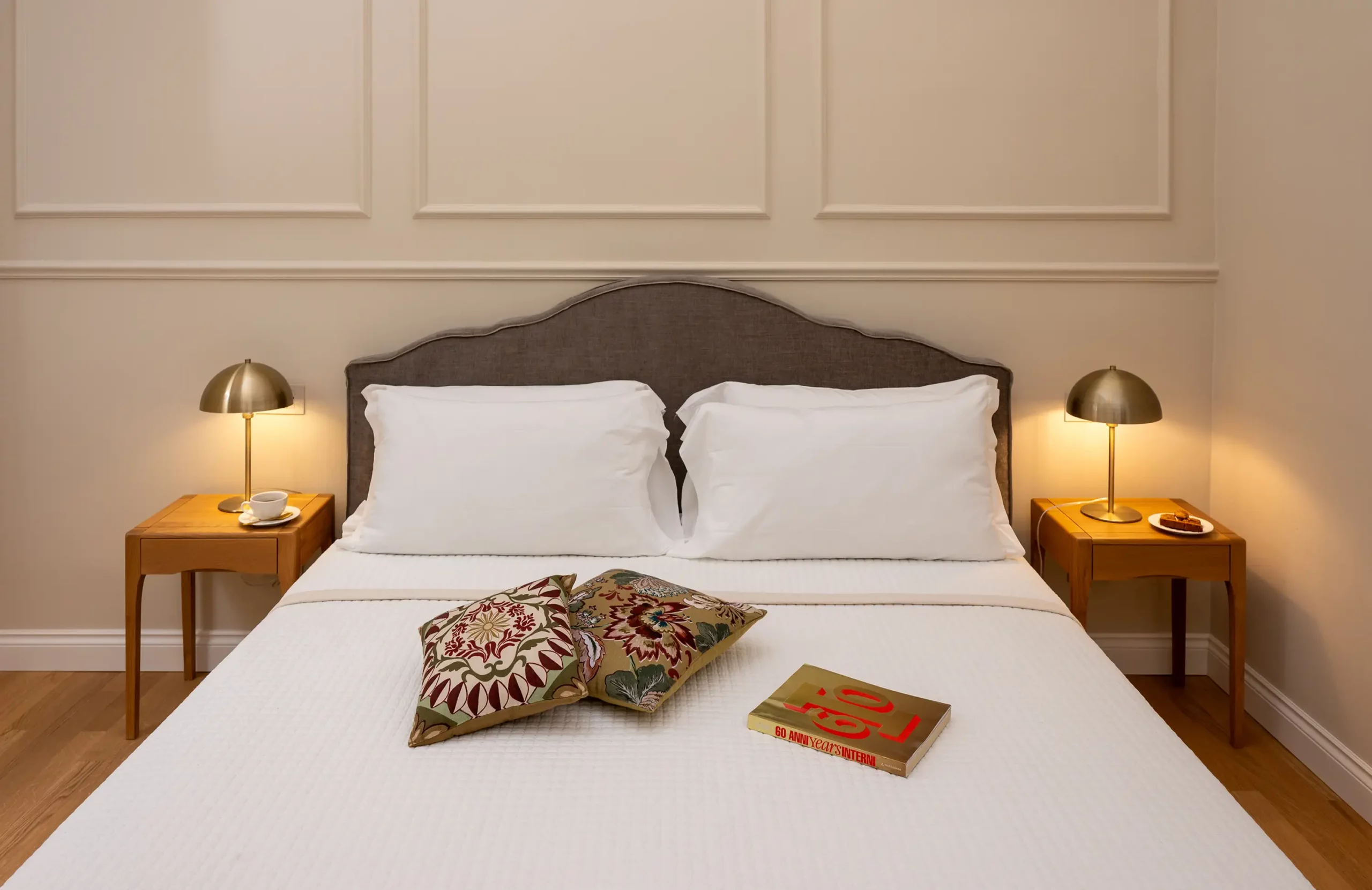 The Superior quarters provide ample space and an opportunity for contemplation on your furnished private balcony. These rooms beautifully combine historic elements—such as the possibility of original 18th-century tiled floors—with modern amenities. The bathrooms are fitted with walk-in rain showers and include exclusive Ortigia skin care products and soft bathrobes. For your convenience, universal electrical outlets are readily available at the bedside, and the climate control (air conditioning and heating) is managed easily via a central wall panel.